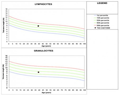 Below is the statistical evolution of telomeres length with chronological age of lymphocytes and granulocytes telomeres length:
